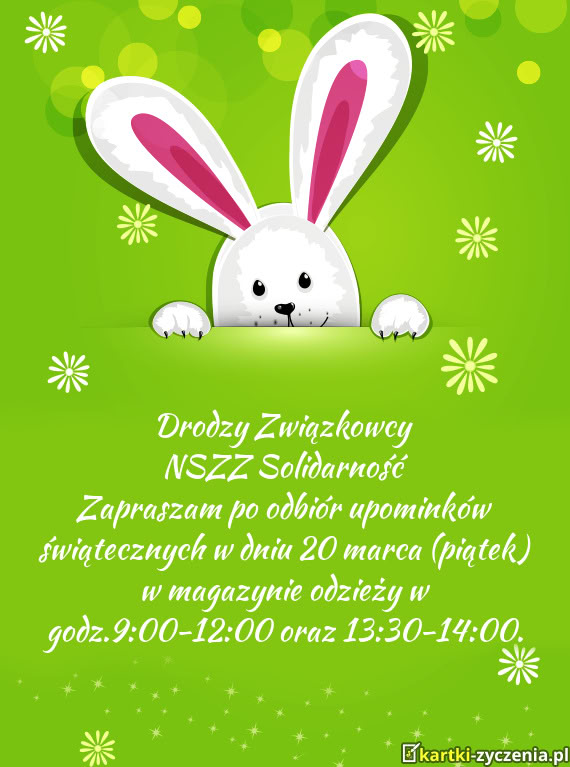Zapraszam po odbiór upominków świątecznych w dniu 20 marca (piątek) w magazynie odzieży w godz.9:00-12:00 oraz 13:30-14:00.