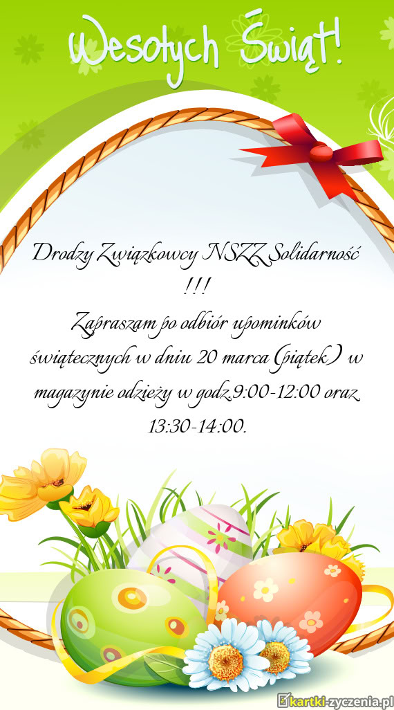 Zapraszam po odbiór upominków świątecznych w dniu 20 marca (piątek) w magazynie odzieży w godz - Gotowa kartka na wielkanoc