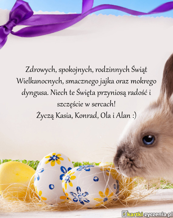 Zdrowych, spokojnych, rodzinnych Świąt Wielkanocnych, smacznego jajka oraz mokrego dyngusa. Niech