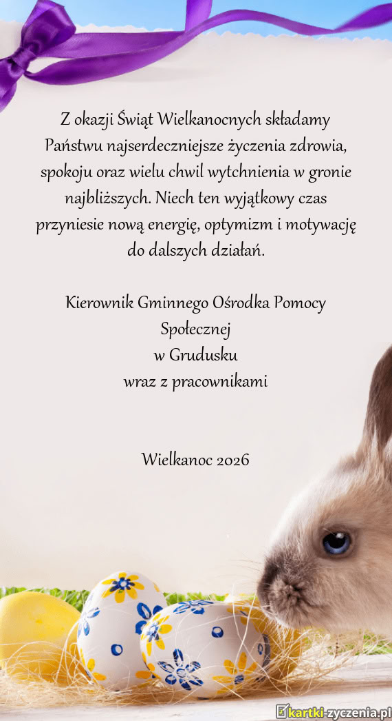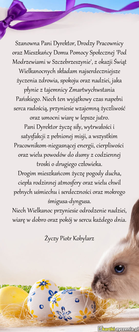 Szanowna Pani Dyrektor, Drodzy Pracownicy oraz Mieszkańcy Domu Pomocy Społecznej "Pod Modrzewiami w Szczebrzeszynie", z okazji Świąt Wielkanocnych składam najserdeczniejsze życzenia zdrowia, spokoju oraz nadziei, jaka płynie z tajemnicy Zmartwychwstania Pańskiego. Niech ten wyjątkowy czas napełni serca radością, przyniesie wzajemną życzliwość oraz umocni wiarę w lepsze jutro.