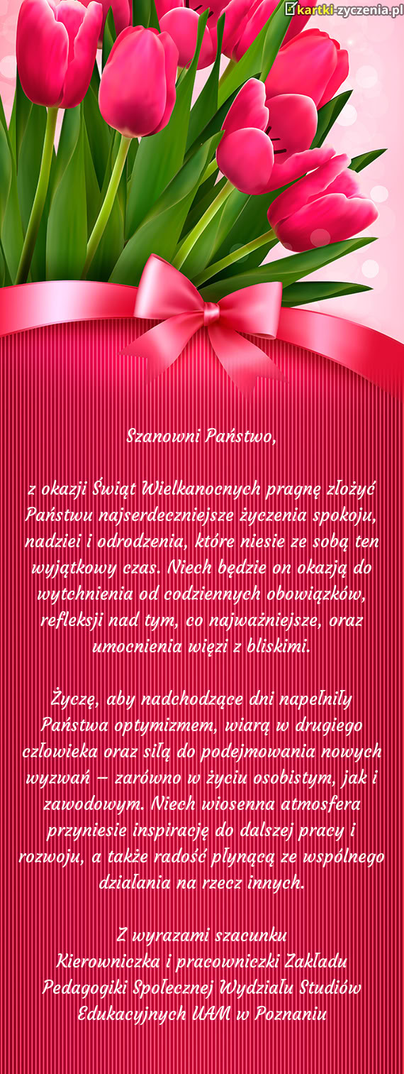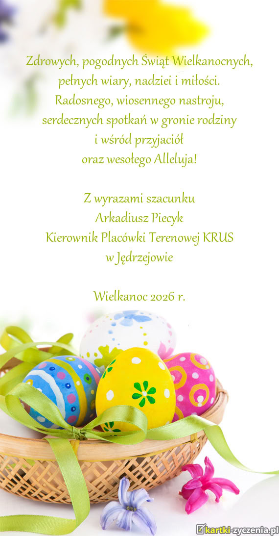 Z okazji Świąt Wielkanocnych pragnę złożyć Państwu najserdeczniejsze życzenia spokoju, nadzi