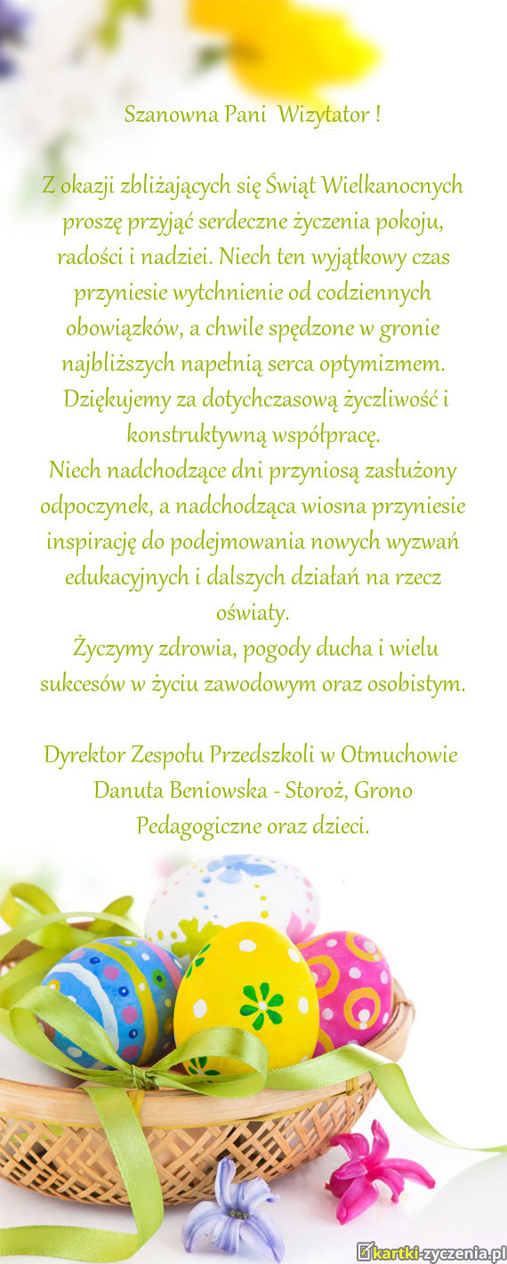 Z okazji zbliżających się Świąt Wielkanocnych proszę przyjąć serdeczne życzenia pokoju, rad