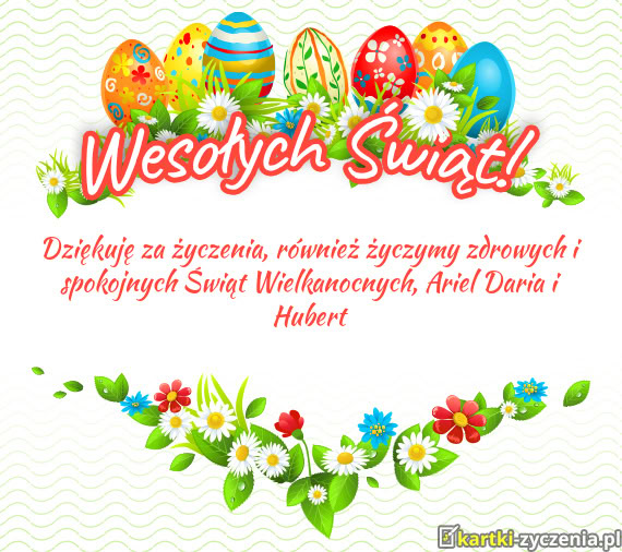 Dziękuję za życzenia, również życzymy zdrowych i spokojnych Świąt Wielkanocnych, Ariel Daria