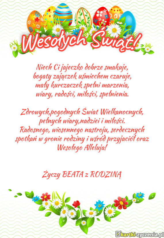 Serdecznych spotkań w gronie rodziny i wśród przyjaciół oraz Wesołego Alleluja!