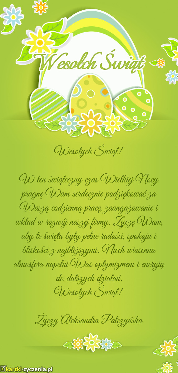 W ten świąteczny czas Wielkiej Nocy pragnę Wam serdecznie podziękować za Waszą codzienną pracę, zaangażowanie i wkład w rozwój naszej firmy. Życzę Wam, aby te święta były pełne radości, spokoju i bliskości z najbliższymi. Niech wiosenna atmosfera napełni Was optymizmem i energią do dalszych działań.