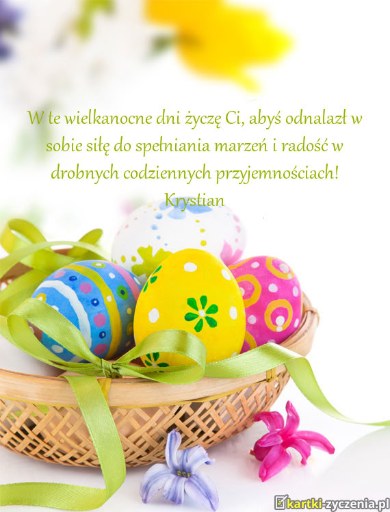 W te wielkanocne dni życzę Ci, abyś odnalazł w sobie siłę do spełniania marzeń i radość w drobnych codziennych przyjemnościach!
