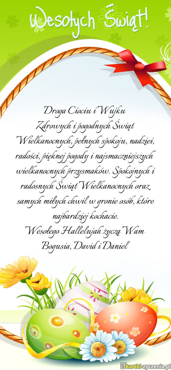 Zdrowych i pogodnych Świąt Wielkanocnych, pełnych spokoju, nadziei, radości, pięknej pogody i najsmaczniejszych wielkanocnych przysmaków. Spokojnych i radosnych Świąt Wielkanocnych oraz samych miłych chwil w gronie osób, które najbardziej kochacie.