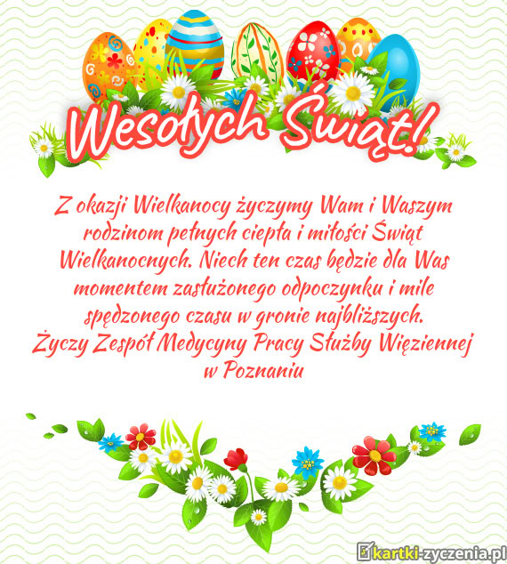 Zdrowych, Pogodnych Świąt Wielkanocnych, przepełnionych wiarą, nadzieją i miłością. Radosnego, wiosennego nastroju, serdecznych spotkań w gronie rodziny i wśród przyjaciół