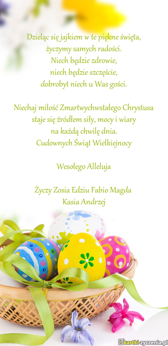 Radosnych świąt Zmartwychwstania Pańskiego oraz Błogosławieństwa Bożego.