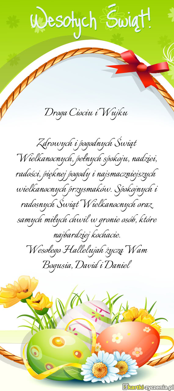 Zdrowych i pogodnych Świąt Wielkanocnych, pełnych spokoju, nadziei, radości, pięknej pogody i najsmaczniejszych wielkanocnych przysmaków. Spokojnych i radosnych Świąt Wielkanocnych oraz samych miłych chwil w gronie osób, które najbardziej kochacie.