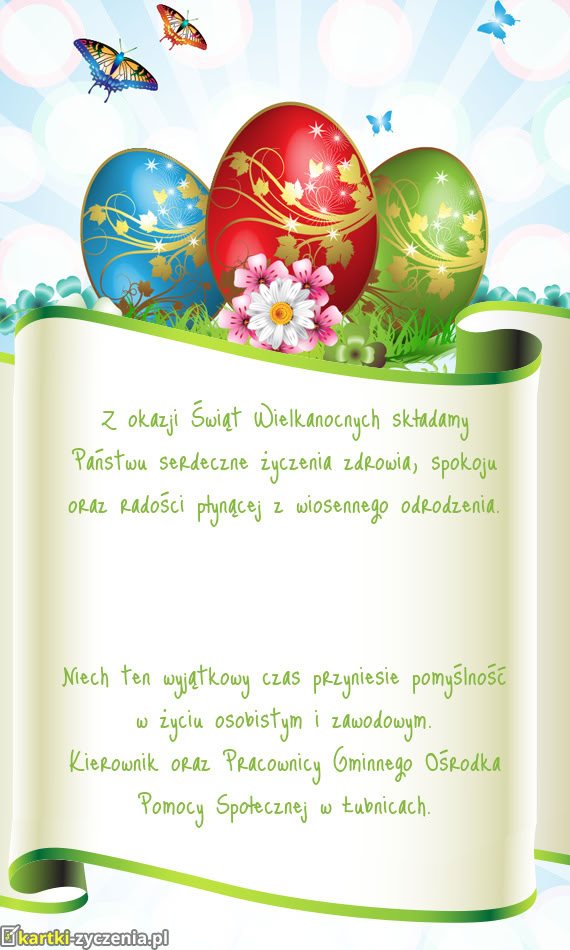 Z okazji Świąt Wielkanocnych składamy Państwu serdeczne życzenia zdrowia, spokoju oraz radości płynącej z wiosennego odrodzenia.