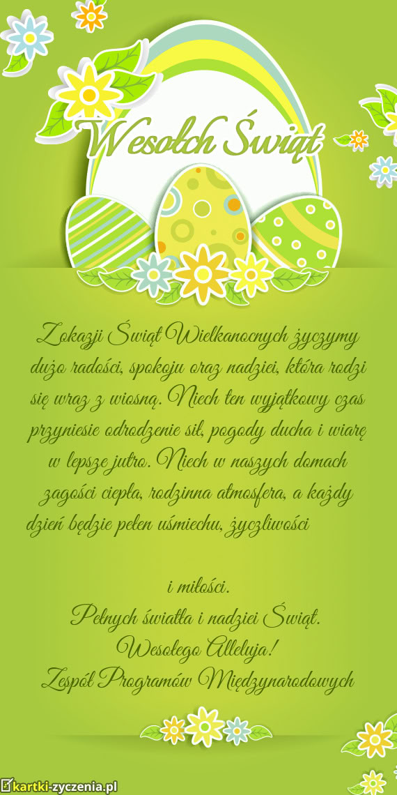 Z okazji Świąt Wielkanocnych życzymy dużo radości, spokoju oraz nadziei, która rodzi się wraz z wiosną. Niech ten wyjątkowy czas przyniesie odrodzenie sił, pogody ducha i wiarę w lepsze jutro. Niech w naszych domach zagości ciepła, rodzinna atmosfera, a każdy dzień będzie pełen uśmiechu, życzliwości i miłości.