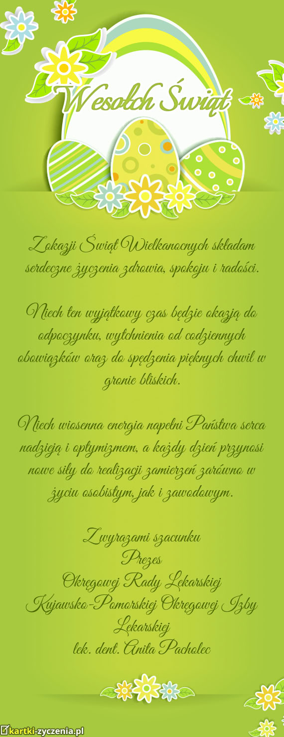 Z okazji Świąt Wielkanocnych składam serdeczne życzenia zdrowia, spokoju i radości.