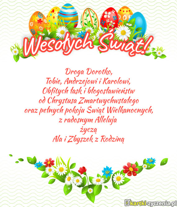 z okazji Świąt Wielkanocnych chciałabym życzyć Tobie i całej Twojej rodzinie oraz Twojej cioci wszystkiego, co najpiękniejsze i najważniejsze – spokoju w sercu, wewnętrznej równowagi i prawdziwej radości z małych rzeczy. Niech ten wyjątkowy czas będzie dla Ciebie chwilą zatrzymania, odpoczynku od codzienności i okazją do spędzenia wartościowych momentów z bliskimi.