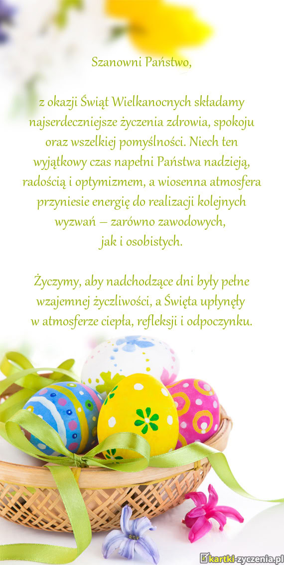 z okazji Świąt Wielkanocnych składamy najserdeczniejsze życzenia zdrowia, spokoju oraz wszelkiej pomyślności. Niech ten wyjątkowy czas napełni Państwa nadzieją, radością i optymizmem, a wiosenna atmosfera przyniesie energię do realizacji kolejnych wyzwań – zarówno zawodowych,