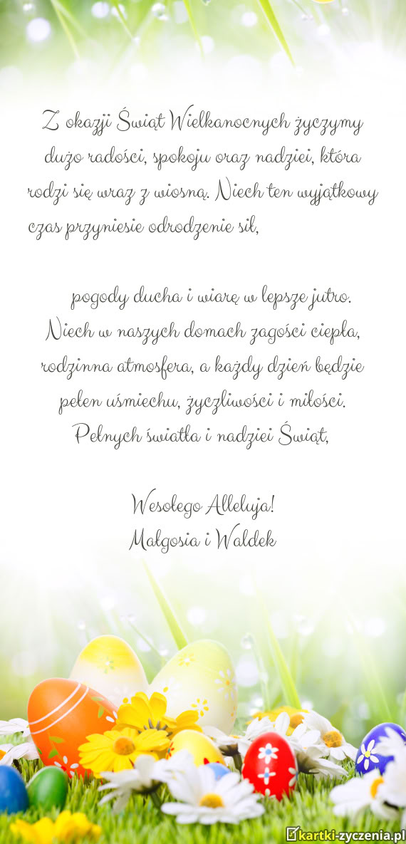Z okazji Świąt Wielkanocnych życzymy dużo radości, spokoju oraz nadziei, która rodzi się wraz z wiosną. Niech ten wyjątkowy czas przyniesie odrodzenie sił, pogody ducha i wiarę w lepsze jutro.