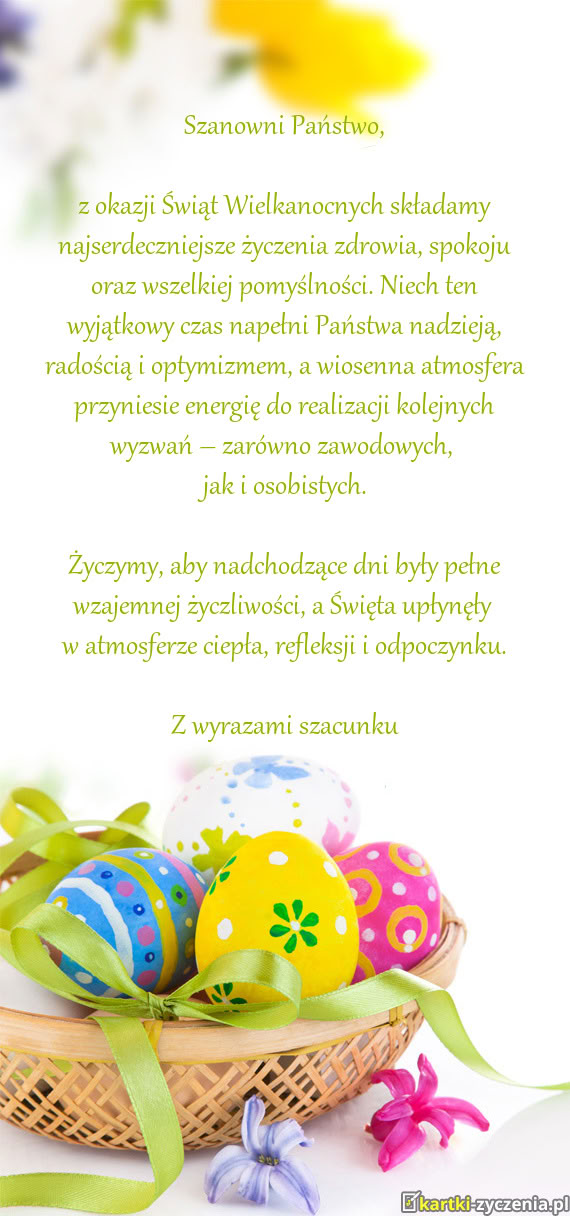z okazji Świąt Wielkanocnych składamy najserdeczniejsze życzenia zdrowia, spokoju oraz wszelkiej pomyślności. Niech ten wyjątkowy czas napełni Państwa nadzieją, radością i optymizmem, a wiosenna atmosfera przyniesie energię do realizacji kolejnych wyzwań – zarówno zawodowych,
